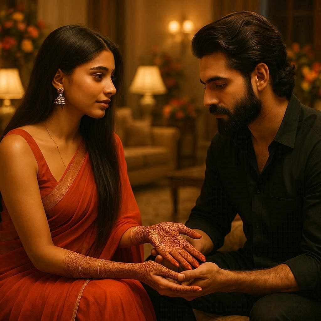 "Alright then," Shivanya clapped, her voice too bright. "Looks like bhai won this round, and we don't have to ask Bhabhi to find her name in his mehndi, considering..." Her gaze flicked to Aryan's hands, wrapped in bandages, marked only with my name.